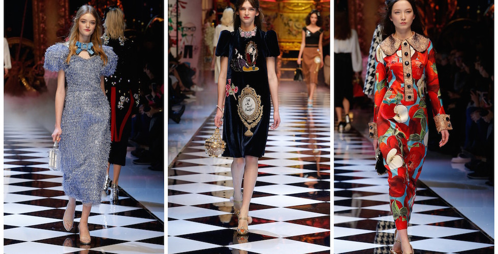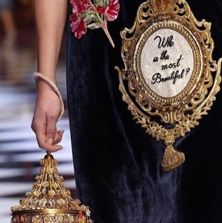 Para a coleção Inverno 2017, os estilistas Domenico Dolce e Stefano Gabbana foram buscar inspiração no universo das princesas da Disney, nos contos de fadas como Cinderella, Branca de Neve, Bela Adormecida, Bela e a Fera. No entanto, nada foi mostrado de uma forma convencional, mas sim através de simbolismos: o Príncipe Encantado era uma menina moderna, que usava um bolero militar todo rebordado sobre calças bombachas, os vestidos de princesas foram bordados com aplicaçãos que traziam as referências dos diversos contos: os ratinhos costurando o vestido de Cinderela, o candelabro do Castelo da Fera, o relógio de Alice no país das maravilhas, etc …O desfile aconteceu ontem (28/2), no Metropol, como sempre. O cenário foi um espetáculo a parte, verdadeiramente um conto de fadas. Logo na entrada entrada, os convidados foram recebidos num imenso set-up onde encontrávamos uma grande árvore com maçãs mágicas penduradas nos galhos, o famoso espelho da bruxa má de Branca de Neve, o tapete mágico de Alladin, a abóbora da Cinderela. No palco, adereços gigantes como os incríveis lustres vieram diretamente das várias óperas produzidas para Teatro La Scala. A idéia por trás da coleção era evocar um sentimento de sonho em cada mulher. De acordo com Domenico e Stefano, toda mulher quer ser uma princesa, ainda que moderna, todas em busca do seu castelo, do seu “príncipe”