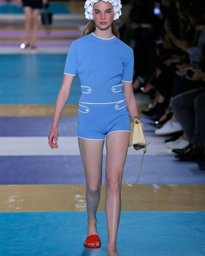 Miuccia Prada mergulhou de cabeça no universo da natação de décadas passadas e trouxe para o desfile da coleção de primavera/verão 2017 da Miu Miu, toucas, roupões de banho e estampas geométricas, com muita alusão aos filmes de Esther Williams, atleta e nadadora que estrelou filmes e conquistou competições de nado sincronizado em meados dos anos 1950 e 1960 nos EUA. Na coleção retrô da Miu Miu não faltavam hotpants de cintura alta, maiôs estampados e detalhes de babados. O desfile aconteceu no Palais D'Iena (5/10) último dia da Paris Fashion week.
